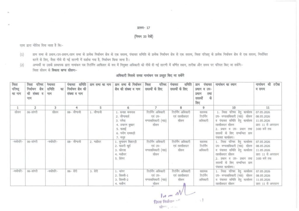 ज़िला निर्वाचन अधिकारी (पंचायत) एवं उपायुक्त सोलन मनमोहन शर्मा ने राज्य निर्वाचन आयोग के निर्देशानुसार विकास खण्ड सोलन, विकास खण्ड कण्डाघाट, विकास खण्ड कुनिहार और विकास खण्ड धर्मपुर में पंचायती राज संस्थाओं के निर्वाचन के दृष्टिगत निर्वाचन कार्यक्रम जारी कर दिया है।